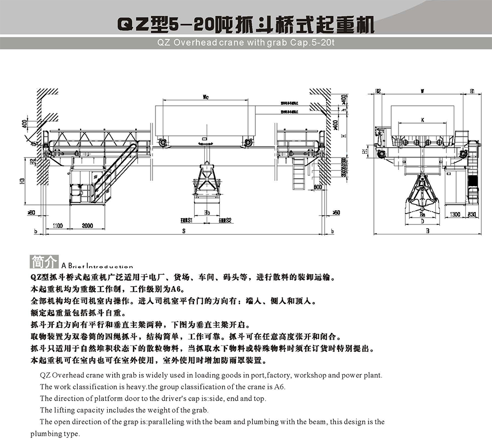 QZ型抓斗橋式起重機其設(shè)計制造符合GB、FEM、IEC等 和 通用標(biāo)準(zhǔn)。其結(jié)構(gòu)有單層車架雙層車架,單卷筒和雙卷筒組;稱量綜合精度≤±1%;具有手動控制、半自動控制和全自動控制三種控制模式、三種控制模式可自由切換,在任何一種自動模式下都具有手動優(yōu)先功能。